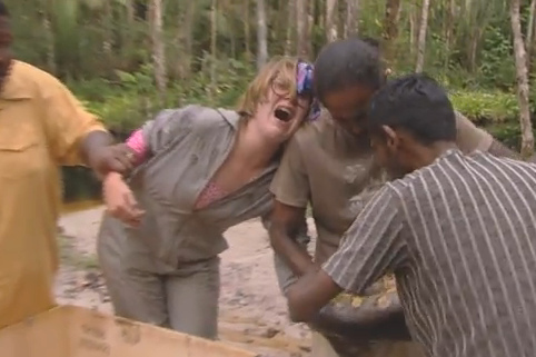Maar voordat Britt over haar nek kon gaan, werden ze in een truck vervoerd door de jungle. Ook dat kon de overigens kerngezonde Michella niet waarderen. Vanuit de achterbak wist ze tijgers, gorilla’s en ander dierengespuis tot ver in de outback te dringen. ‘Ik haat dit zo. Wat een ellende, wat een ellende. Hij rijdt echt hard, die meneer. Ik vind dit echt niet leuk meer!’