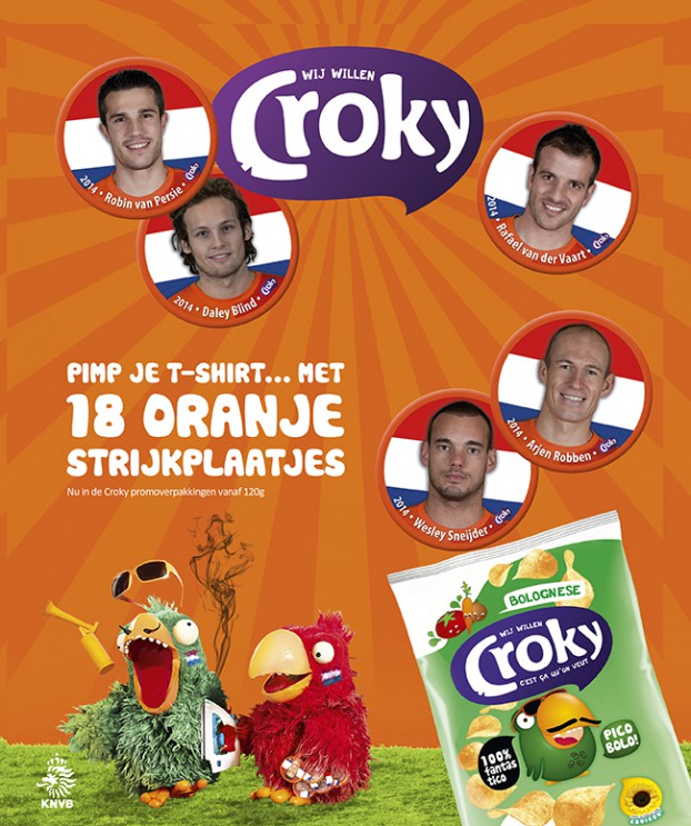 Chipsmerk Croky heeft het dit jaar net even wat anders aangepakt met plakplaatjes die met de strijkbout op kleding kunnen worden geplakt. En wie staan op die plakplaatjes? De achttien beste Oranjespelers als Robin van Persie en Klaas Jan Huntelaar. Wil je alle plakplaatjes hebben? Dan kan je naar de website http://croky.nl/nl/wk-actie om een berichtje achter te laten welke plaatjes jij nog nodig hebt.